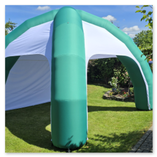 Da sie ein eingebautes Gebläse haben, müssen klassische aufblasbare Zelte ständig mit Luft versorgt werden. Daher benötigen sie einen Stromanschluss. Die Zelte sind deshalb immer gut gefüllt und weisen keine Falten auf.