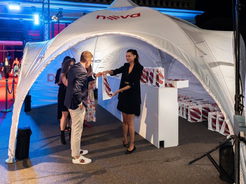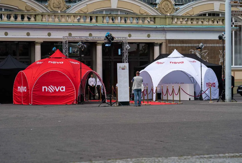 Das Kuppelzelt besticht durch seine moderne Gestaltung und die außergewöhnliche Form. Es stellt eine stabile und funktionale Struktur bereit, die selbst bei ungünstigen Wetterbedingungen gute Dienste verrichtet. Wenn unsere Kunden ein hochwertiges Markenimage kreieren wollen, ist dies das Zelt, für das sie sich am häufigsten entscheiden. Der Gesamteindruck wird durch Werbefahnen ergänzt, die die Sichtbarkeit des Standes aus der Distanz erheblich steigern und ein dynamisches Werbeelement schaffen, das Blicke auf sich zieht.