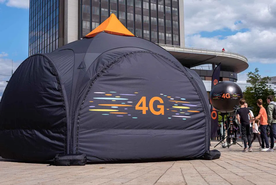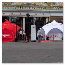 Bei dem Kuppelzelt handelt es sich um eine Rahmenkonstruktion, die weder eine Pumpe noch einen Stromanschluss benötigt. Dank seiner großen Höhe können größere Elemente als bei herkömmlichen Zelten präsentiert werden. Für große Werbedrucke ist es wichtig, dass Grafiken klar und unverzerrt dargestellt werden können. Dies wird durch eine präzise angepasste Abdeckung ermöglicht.