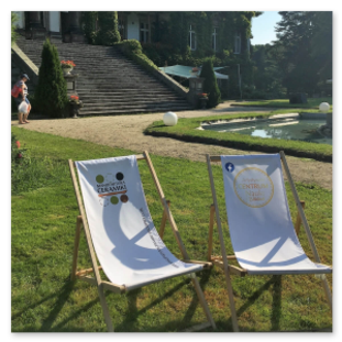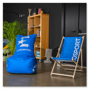 - Ein Werbeliegestuhl mit beidseitigem Druck – der Bezug ist so gestaltet, dass die Grafik von beiden Seiten gut sichtbar ist, unabhängig davon, wie der Stuhl positioniert ist.