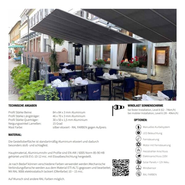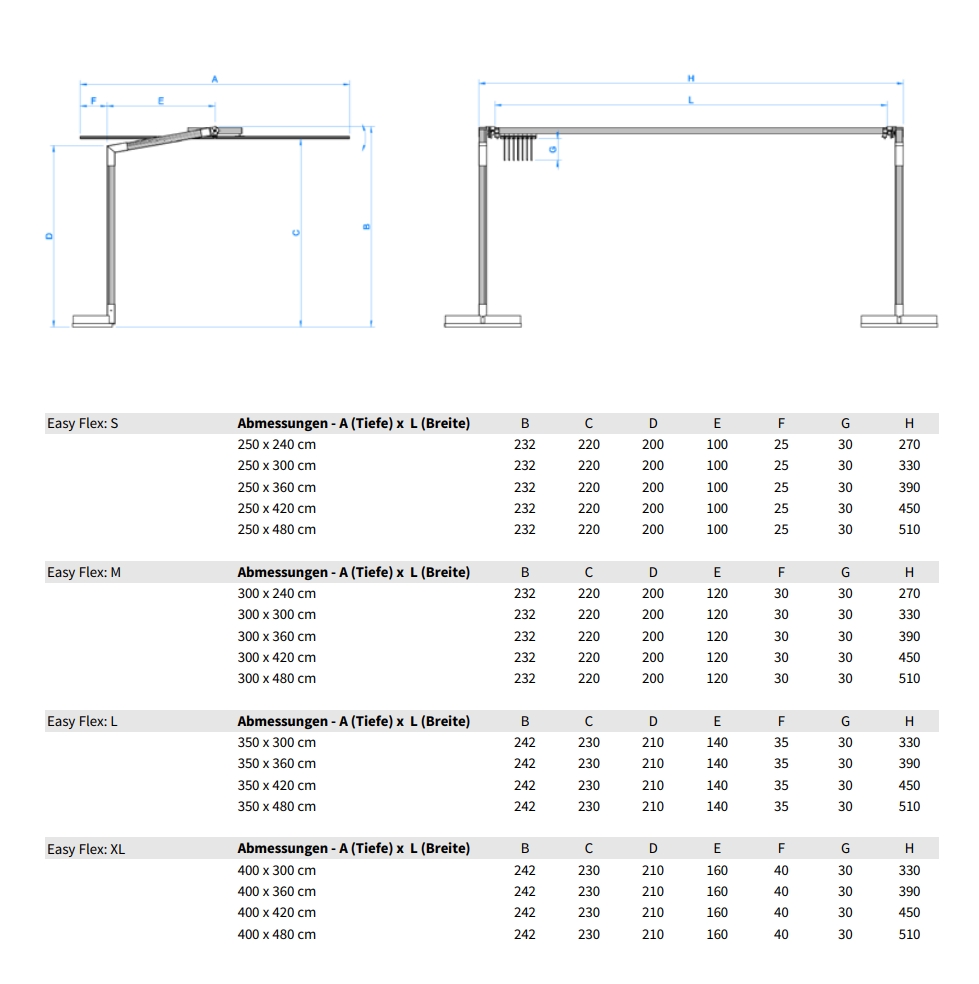 Die freistehenden Design-Markisen der Easyflex-Serie bieten eine Kombination aus elegantem Design, robuster Bauweise und höchster Flexibilität. In vier Größen (S, M, L und XL) erhältlich, sind diese Markisen ideal für kompakte Balkone sowie großflächige Restaurantterrassen. Jedes Modell wurde gezielt für seinen spezifischen Einsatzbereich entworfen.