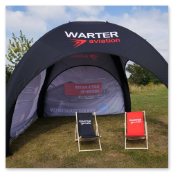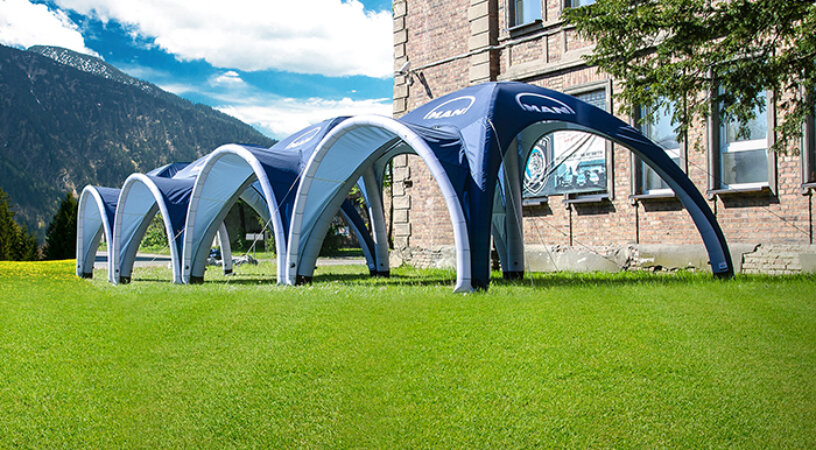 Die stabilen und wetterfesten pneumatischen Dome-Zelte können individuell bedruckt werden. Weil sie luftdicht sind und eine innovative Konstruktion besitzen, benötigen Sie kein Dauergebläse. Das macht sie äußerst effektiv und unabhängig von Stromquellen – ideal für mobile Einsätze.