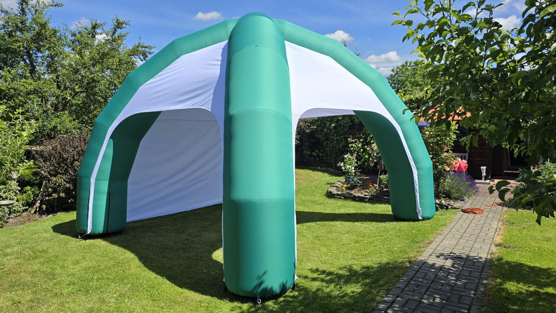 Da sie ein eingebautes Gebläse haben, müssen klassische aufblasbare Zelte ständig mit Luft versorgt werden. Daher benötigen sie einen Stromanschluss. Die Zelte sind deshalb immer gut gefüllt und weisen keine Falten auf.