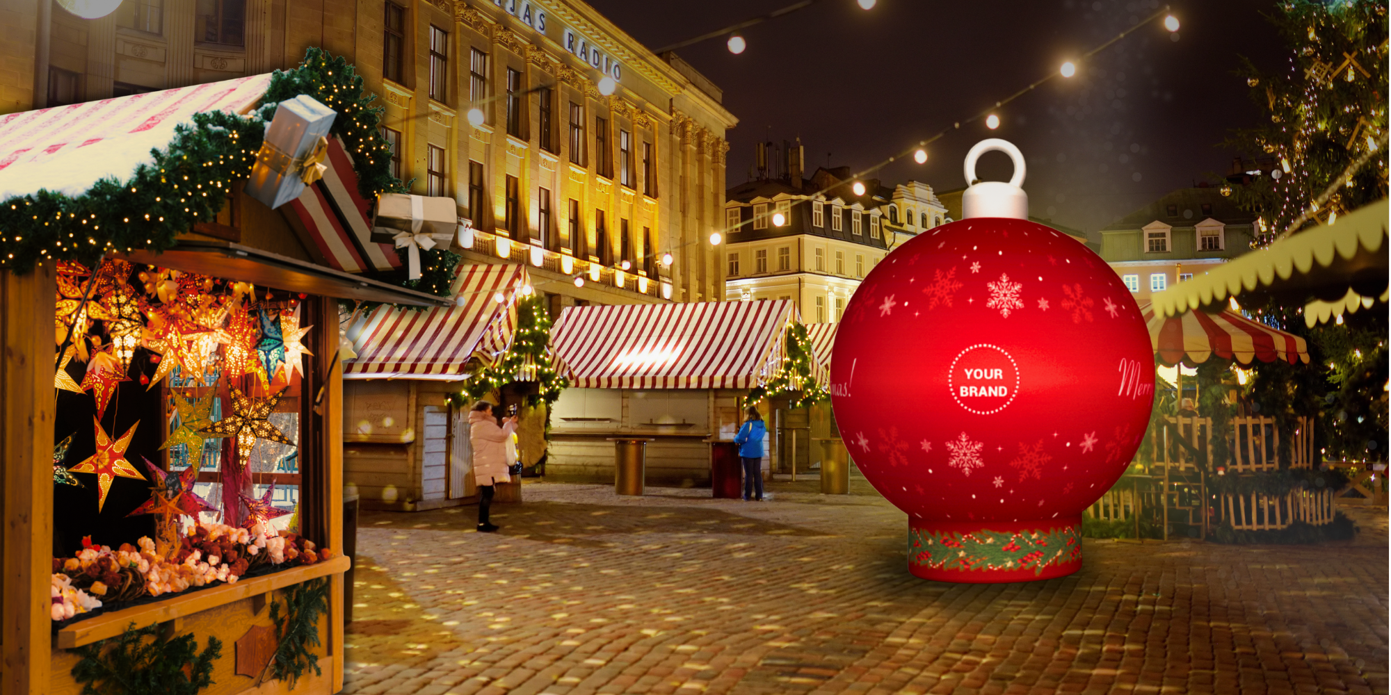 Präsentieren Sie Ihre Marke in der schönsten Jahreszeit als Blickfang! Die aufblasbaren Weihnachtsdekorationen kombinieren eine auffällige Dekoration mit einem starken Werbeträger. Überdimensionale Weihnachtskugeln, Weihnachtsmänner und Zuckerstangen in XL-Größe erregen die Aufmerksamkeit der Vorbeigehenden und kreieren so eine außergewöhnliche, festliche Stimmung in Städten, Shoppingcentern und Hotels. Mit Ihrem Firmenlogo versehen, wird jede Dekoration zu einem einzigartigen und auffälligen Markensymbol.