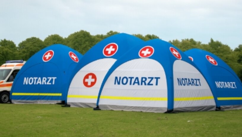 Die Einsatz- und Rettungszelte bestehen aus hochwertigem Polyestergewebe mit PU-Beschichtung, was sie äußerst resistent gegen Wind, Regen und UV-Strahlung macht. Die Dächer und Seitenwände können nach Wunsch bedruckt werden – sei es mit Logos, Sponsorenaufdrucken oder maßgeschneiderten Designs.