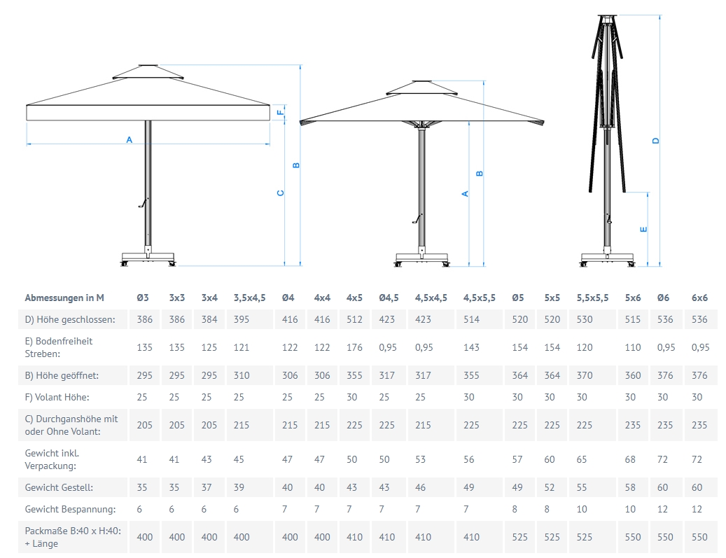 | Höhe geöffnet | 295cm | 310cm | 355cm | 355cm | 360cm |