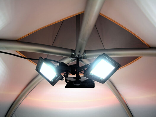 Bei dem Kuppelzelt handelt es sich um eine Rahmenkonstruktion, die weder eine Pumpe noch einen Stromanschluss benötigt. Dank seiner großen Höhe können größere Elemente als bei herkömmlichen Zelten präsentiert werden. Für große Werbedrucke ist es wichtig, dass Grafiken klar und unverzerrt dargestellt werden können. Dies wird durch eine präzise angepasste Abdeckung ermöglicht.