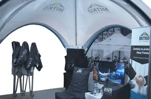 Das Kuppelzelt besticht durch seine moderne Gestaltung und die außergewöhnliche Form. Es stellt eine stabile und funktionale Struktur bereit, die selbst bei ungünstigen Wetterbedingungen gute Dienste verrichtet. Wenn unsere Kunden ein hochwertiges Markenimage kreieren wollen, ist dies das Zelt, für das sie sich am häufigsten entscheiden. Der Gesamteindruck wird durch Werbefahnen ergänzt, die die Sichtbarkeit des Standes aus der Distanz erheblich steigern und ein dynamisches Werbeelement schaffen, das Blicke auf sich zieht.