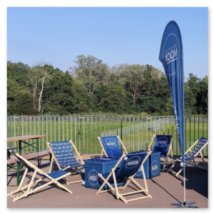 - Ein Werbeliegestuhl mit beidseitigem Druck – der Bezug ist so gestaltet, dass die Grafik von beiden Seiten gut sichtbar ist, unabhängig davon, wie der Stuhl positioniert ist.