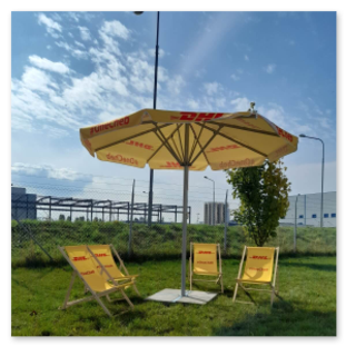 - Ein Werbeliegestuhl mit einseitigem Druck, ergänzt durch ein zusätzliches Sonnendach über der Rückenlehne, um mehr Werbefläche zu bieten.