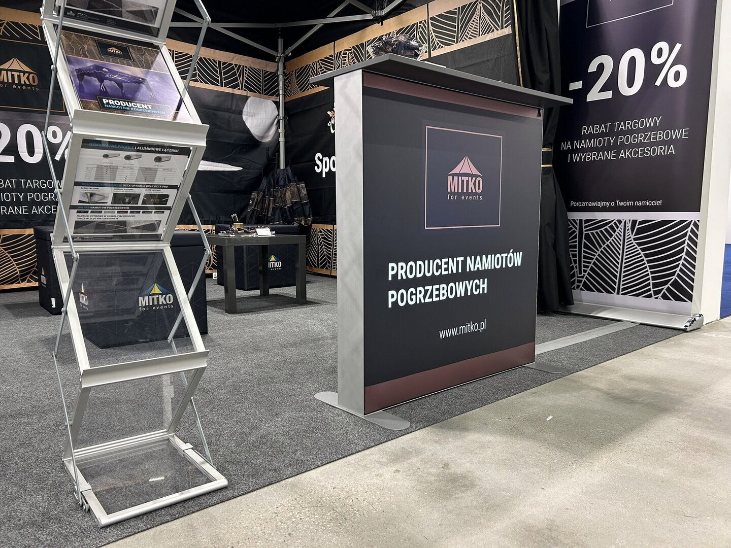 Der Messestand kann aufgrund seiner faltbaren Bauweise schnell und ohne Mühe transportiert und aufgebaut werden. Die austauschbare Abdeckung erlaubt einen einfachen Grafikwechsel zwischen den Events, während das zusätzliche Innenregal praktischen Stauraum für Werbematerialien und kleinere Accessoires bietet.