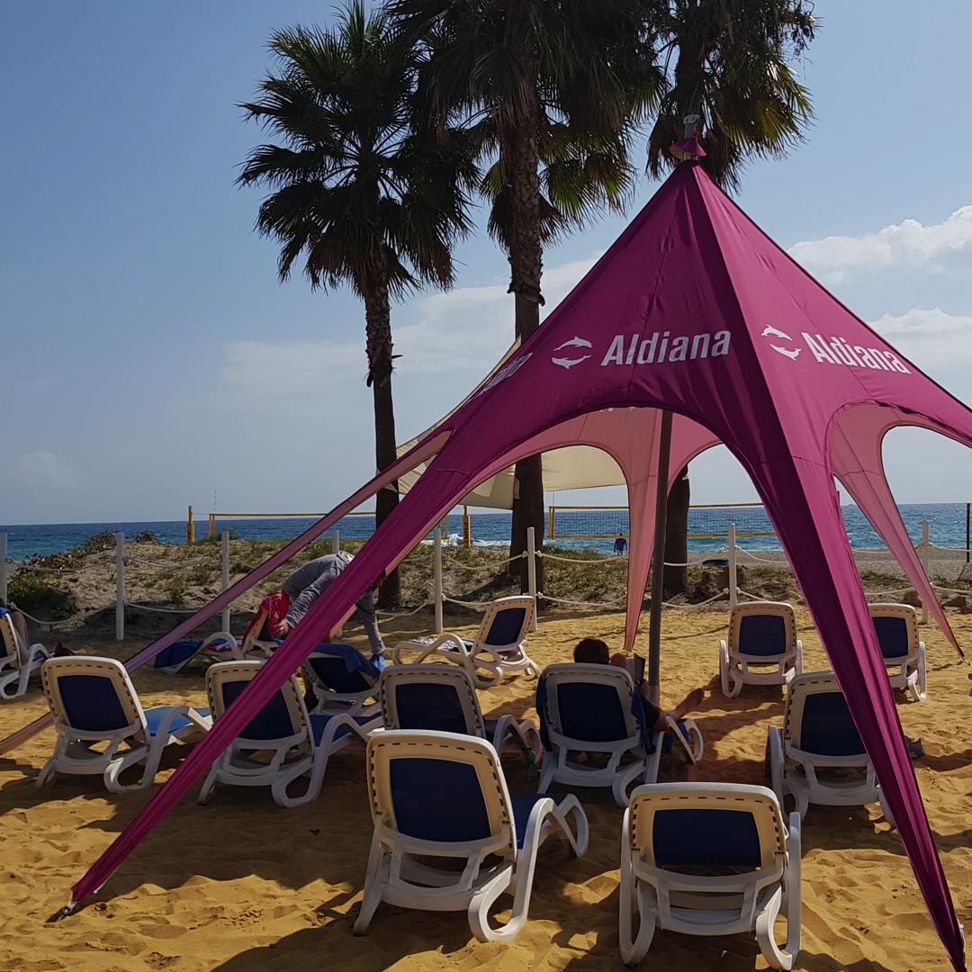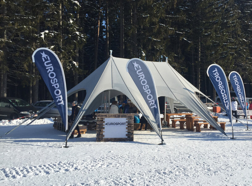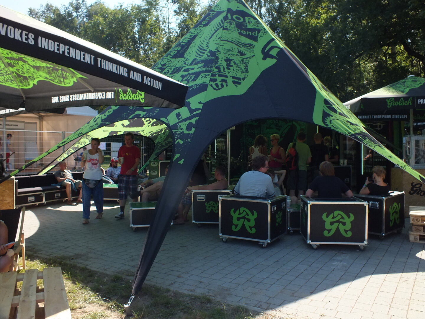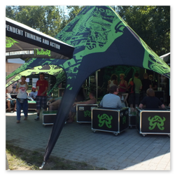 Das Sternzelt lässt Sie ohne Anstrengung aus der Menge herausstechen. Sie können darauf ein großes Logo oder eine Grafik anbringen lassen – aufgrund seiner Höhe von über 4 Metern ist es auch aus der Distanz gut zu sehen. Platzieren Sie daneben Werbefahnen, um zusätzliche Aufmerksamkeit zu erzeugen und den Besuchern die Auffindbarkeit Ihres Standes zu erleichtern. Wünschen Sie, dass sie länger bleibt? Fügen Sie ihn mit Liegen und Werbeschirmen hinzu, die individuell bedruckt sind – alles wirkt stimmig und professionell, ohne dass Sie Elemente von verschiedenen Anbietern beziehen müssen