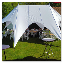Wenn Sie gut sichtbar sein möchten und einen soliden Arbeitsbereich im Inneren benötigen, ist die Wahl einfach – dieses Sternzelt. Sein einmaliges Design mit zentralem Mast und breiten Armen zieht die Aufmerksamkeit auf sich. Praktisch heißt das: Raum für Sonnenliegen, eine Bühne und Picknicktische – und zugleich viel Freiraum. Er ist ideal für große Flächen, Plätze und überall dort, wo der erste Eindruck entscheidend ist.